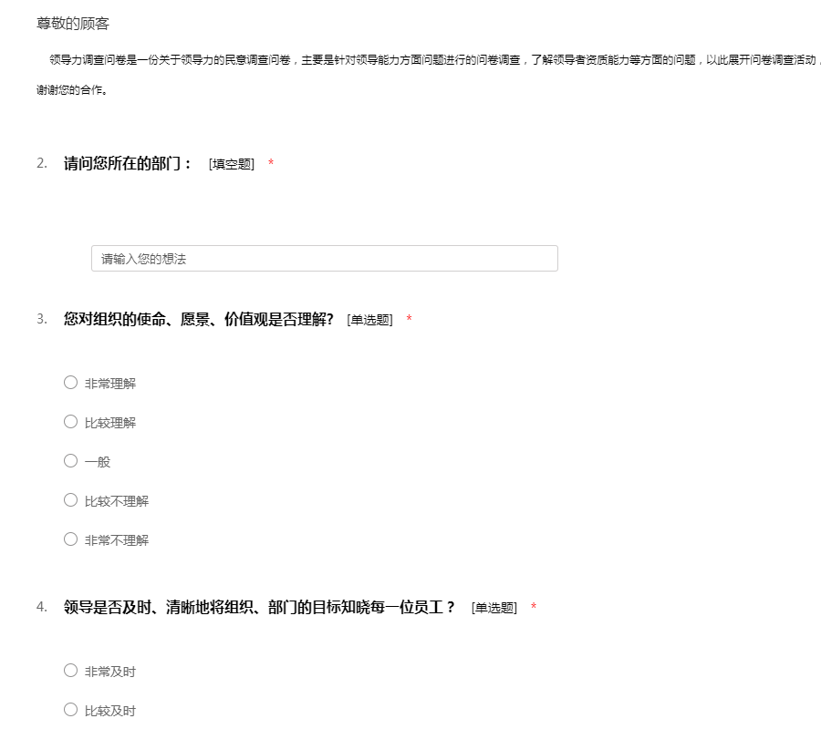 领导力调查问卷是一份关于领导力的民意调查问卷,主要是针对领导能力方面问题进行的问卷调查,了解领导者资质能力等方面的问题,以此展开问卷调查活动,耽误您一些宝贵时间,回答领导力调查问卷,谢谢您的合作。