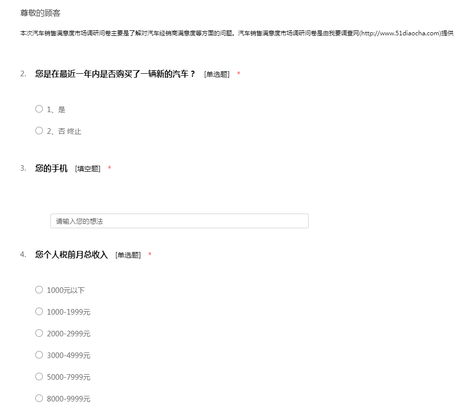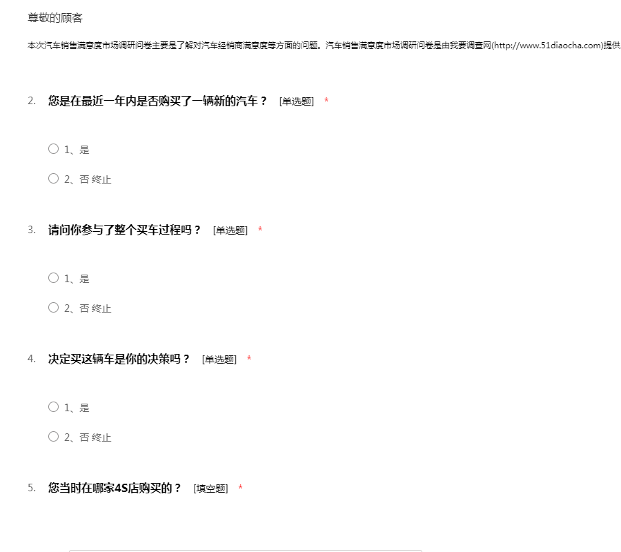 本次汽车销售满意度市场调研问卷主要是了解对汽车经销商满意度等方面的问题。汽车销售满意度市场调研问卷是由我要调查网(http://www.51diaocha.com)提供。