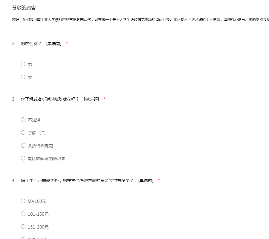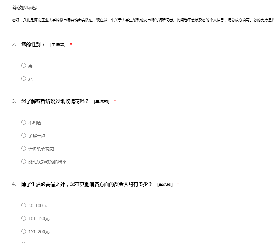 您好,我们是河南工业大学模拟市场营销参赛队伍,现在做一个关于大学生纸玫瑰花市场的调研问卷。此问卷不会涉及您的个人信息,请您放心填写。您的支持是我们前进的动力,谢谢!