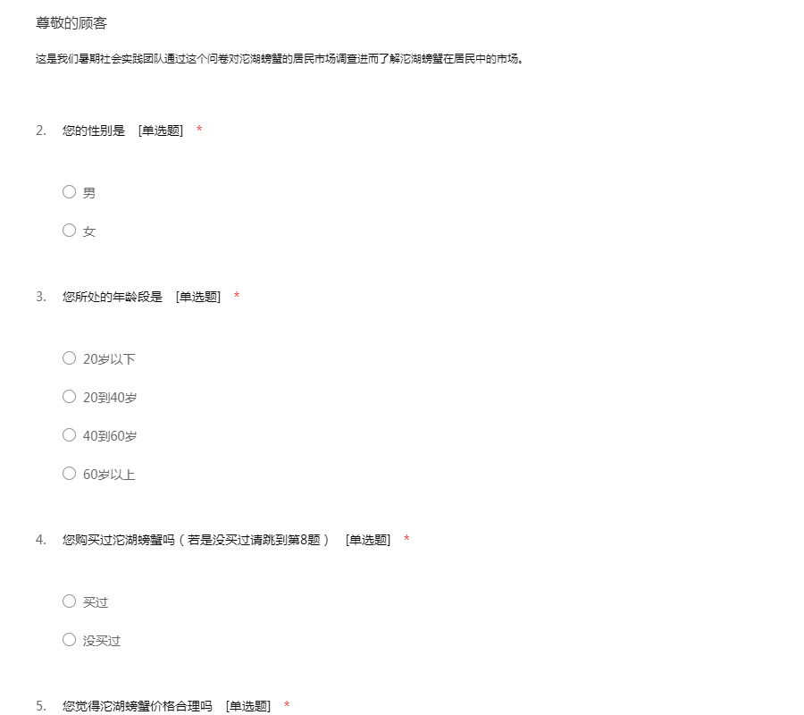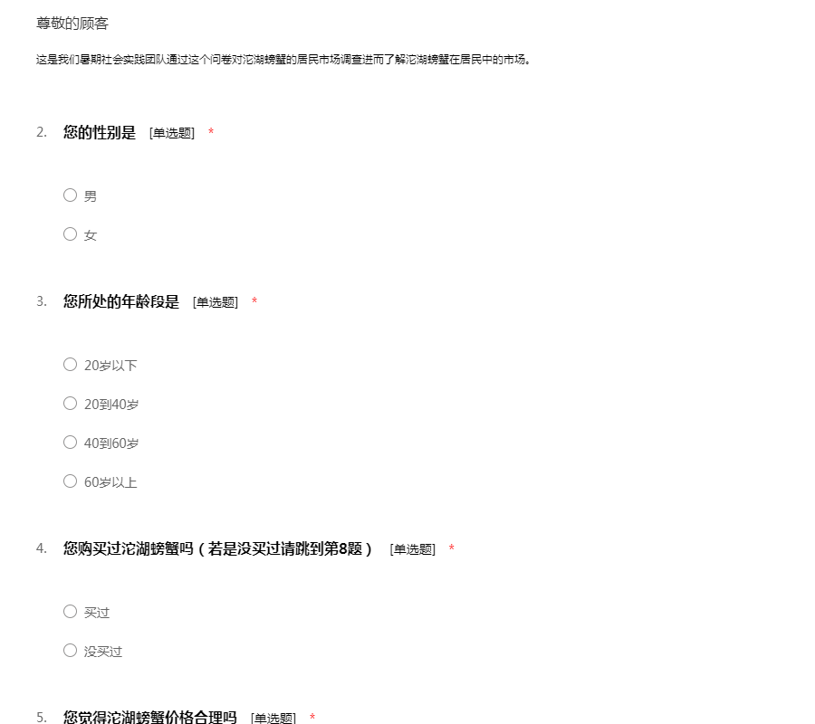 这是我们暑期社会实践团队通过这个问卷对沱湖螃蟹的居民市场调查进而了解沱湖螃蟹在居民中的市场。