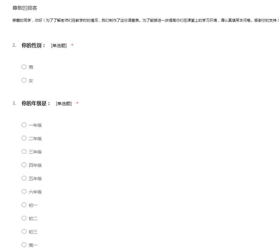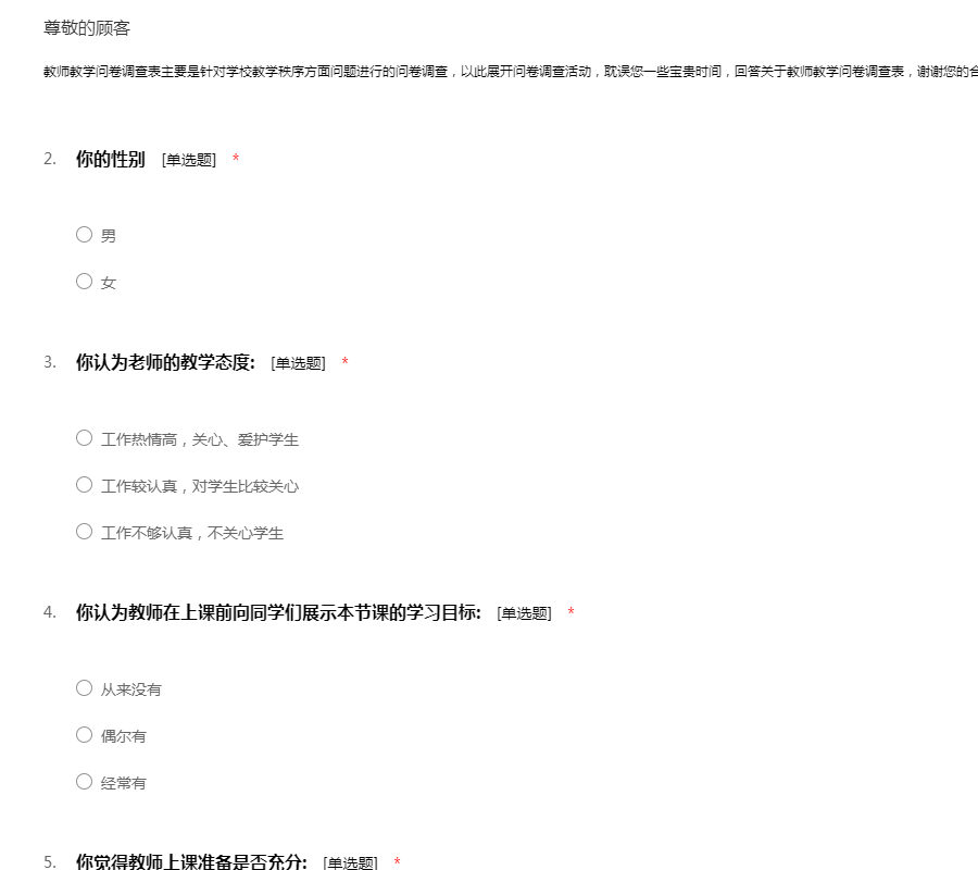 亲爱的同学,你好!为了了解老师们在教学时的情况,我们制作了这份调查表。为了能够进一步提高你们在课堂上的学习环境,请认真填写本问卷。感谢你的支持!
