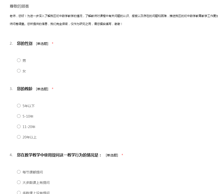 老师,您好!为进一步深入了解我区初中数学教学的情况,了解教师对课程中有关问题的认识、感受以及存在的问题和困难,推进我区的初中数学教育教学工作更加健康有序地发展,请您协助完成这次初中数学教师问卷调查。您所提供的信息,我们完全保密,仅作为研究之用,请您据实填写,谢谢!