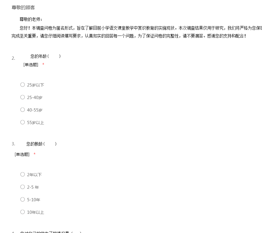 尊敬的老师:您好!本调查问卷为匿名形式,旨在了解目前小学语文课堂教学中赏识教育的实施现状。本次调查结果仅用于研究,我们将严格为您保密。由于您所填写的内容对本论文的顺利完成至关重要,请您仔细阅读填写要求,认真如实的回答每一个问题,为了保证问卷的完整性,请不要漏答。感谢您的支持和配合!