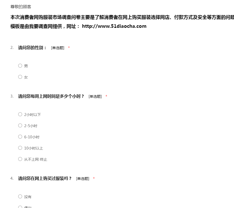 本次消费者网购服装市场调查问卷主要是了解消费者在网上购买服装选择网店、付款方式及安全等方面的问题。消费者网购服装市场调查问卷模板是由我要调查网提供,网址: http://www.51diaocha.com