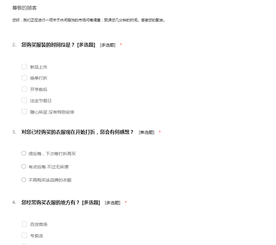 您好,我们正在进行一项关于休闲服饰的市场问卷调查,耽误您几分钟的时间。感谢您的配合。