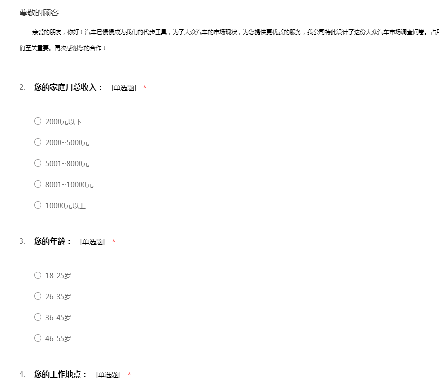 ——亲爱的朋友,你好!汽车已慢慢成为我们的代步工具,为了大众汽车的市场现状,为您提供更优质的服务,我公司特此设计了这份大众汽车市场调查问卷。占用您几分钟时间填写这份问卷,您的宝贵建议对我们至关重要。再次感谢您的合作!