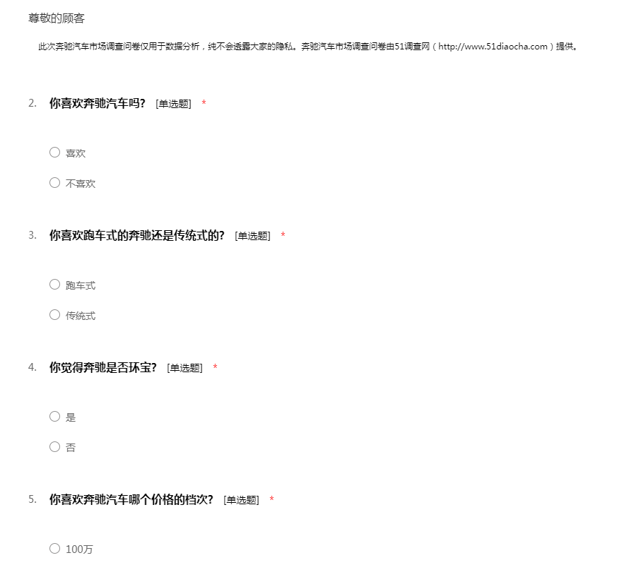 此次奔驰汽车市场调查问卷仅用于数据分析,纯不会透露大家的隐私。奔驰汽车市场调查问卷由51调查网(http://www.51diaocha.com)提供。
