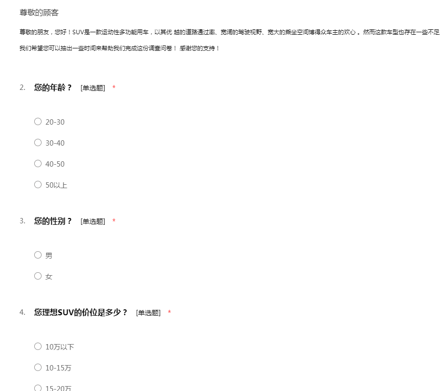尊敬的朋友,您好!SUV是一款运动性多功能用车,以其优 越的道路通过率、宽阔的驾驶视野、宽大的乘坐空间博得众车主的欢心 。然而这款车型也存在一些不足之处,如油耗过、排量较大、用车成本 较高等。我们希望您可以抽出一些时间来帮助我们完成这份调查问卷! 感谢您的支持!