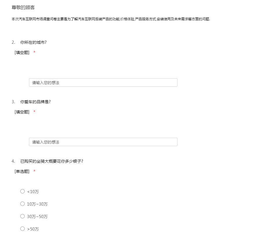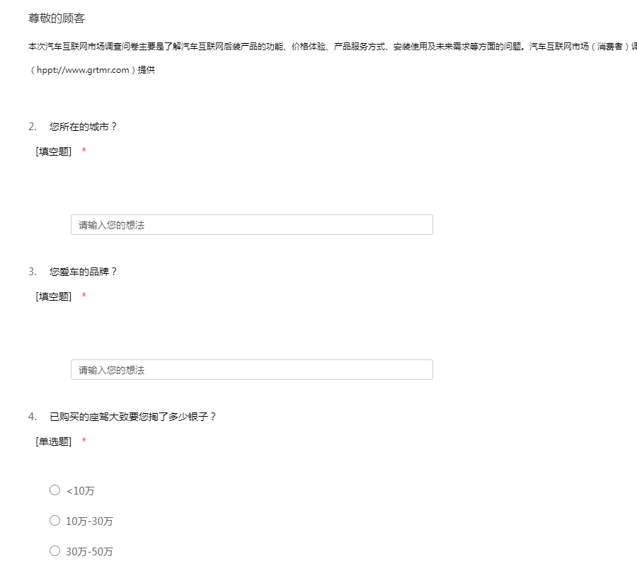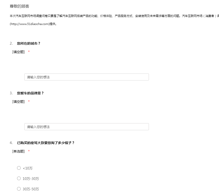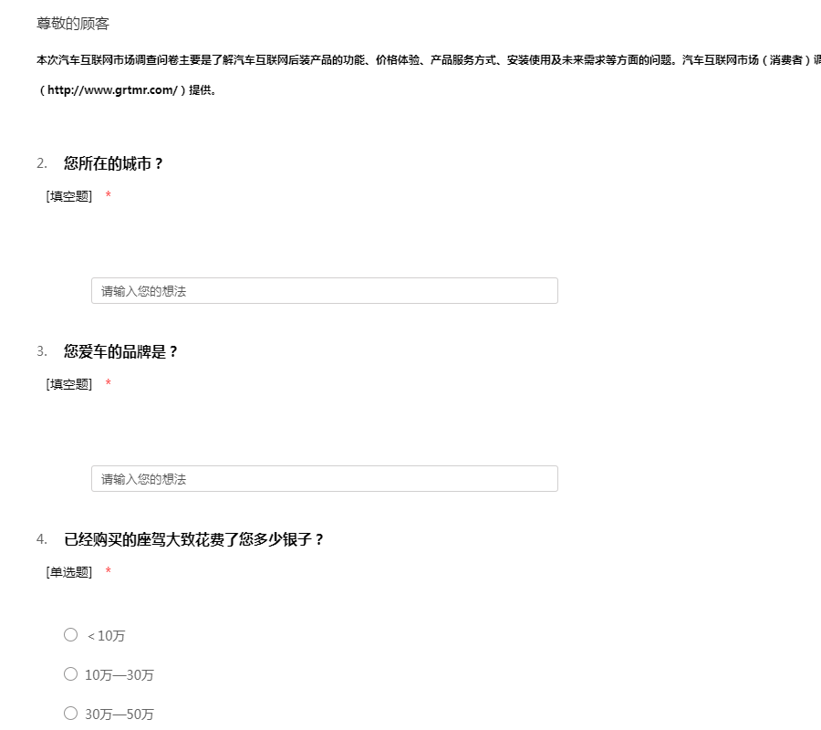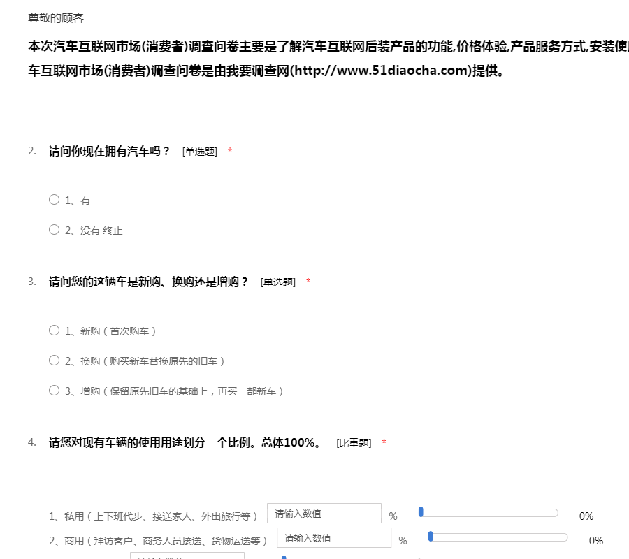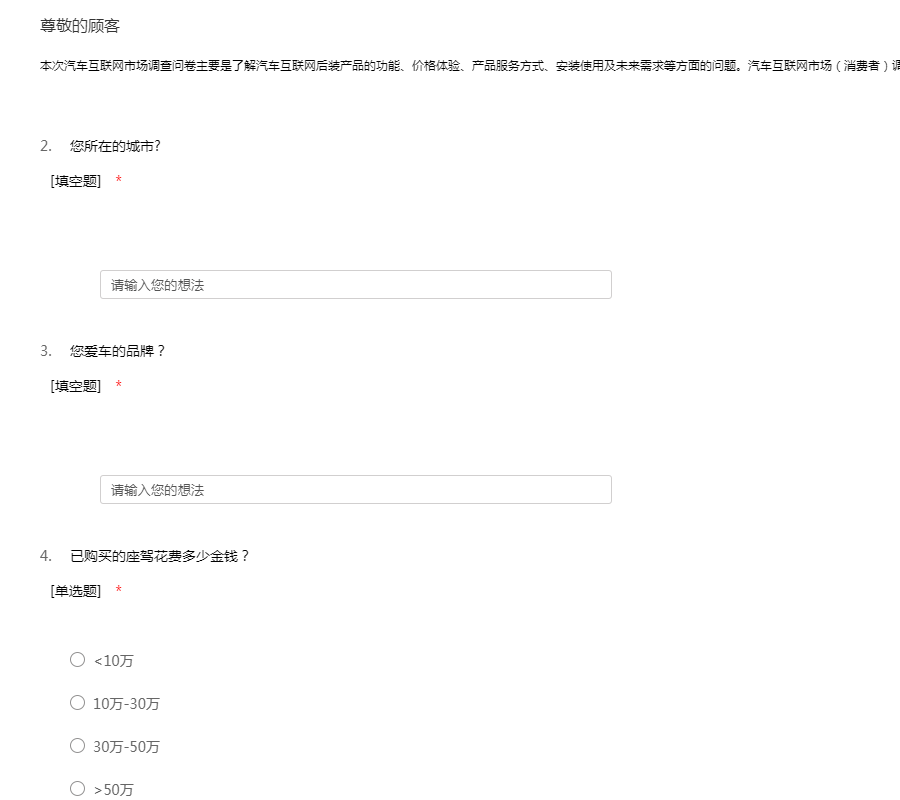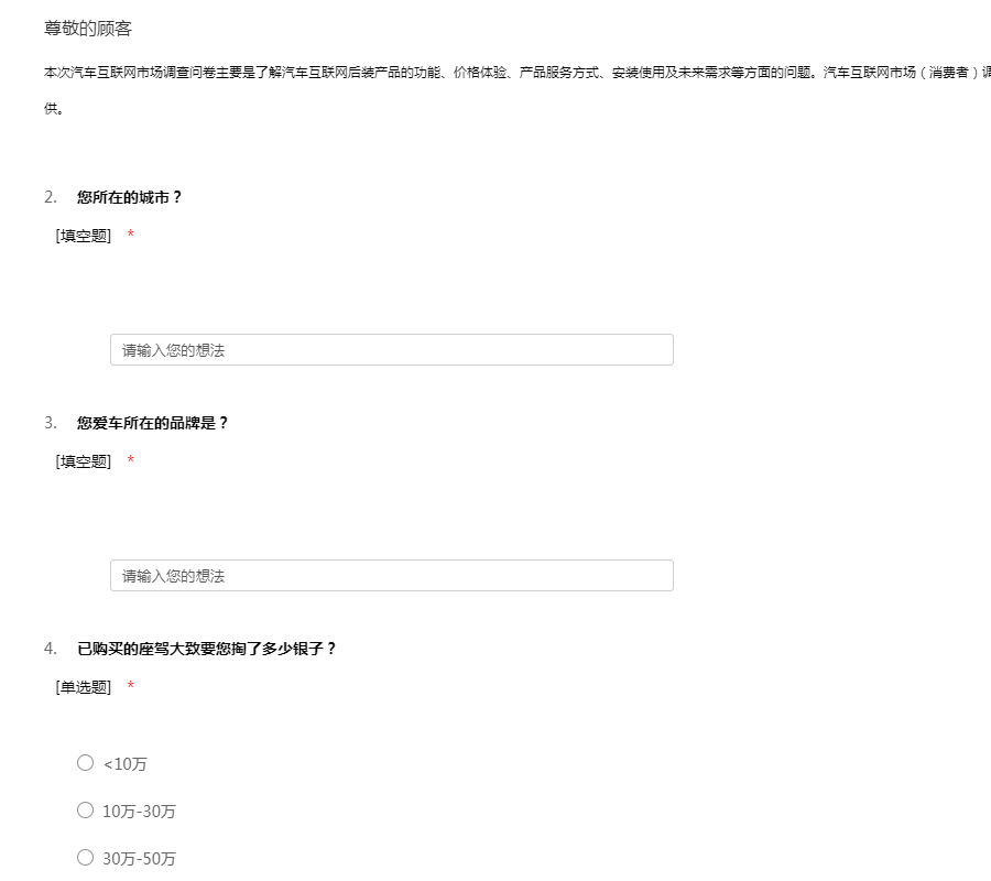 本次汽车互联网市场调查问卷主要是为了解汽车互联网后装产品的功能,价格体验,产品服务方式,安装使用及未来需求等方面的问题.