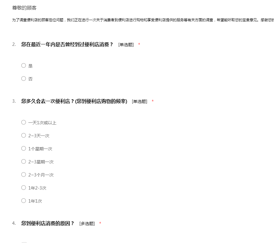为了调查便利店的顾客定位问题,我们正在进行一次关于消费者到便利店进行购物和享受便利店提供的服务等有关方面的调查,希望能听取您的宝贵意见。感谢您的支持与配合!