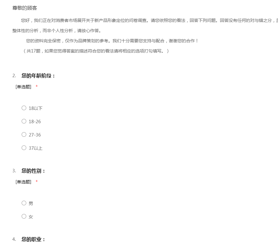 您好,我们正在对消费者市场展开关于新产品形象定位的问卷调查。请您依照您的看法,回答下列问题。回答没有任何的对与错之分,且仅供研究使用。本次调查只是用来进行整体性的分析,而非个人性分析,请放心作答。 您的资料完全保密,仅作为品牌策划的参考。我们十分需要您支持与配合,谢谢您的合作! (共17题,如果您觉得答案的描述符合您的看法请将相应的选项打勾填写。)