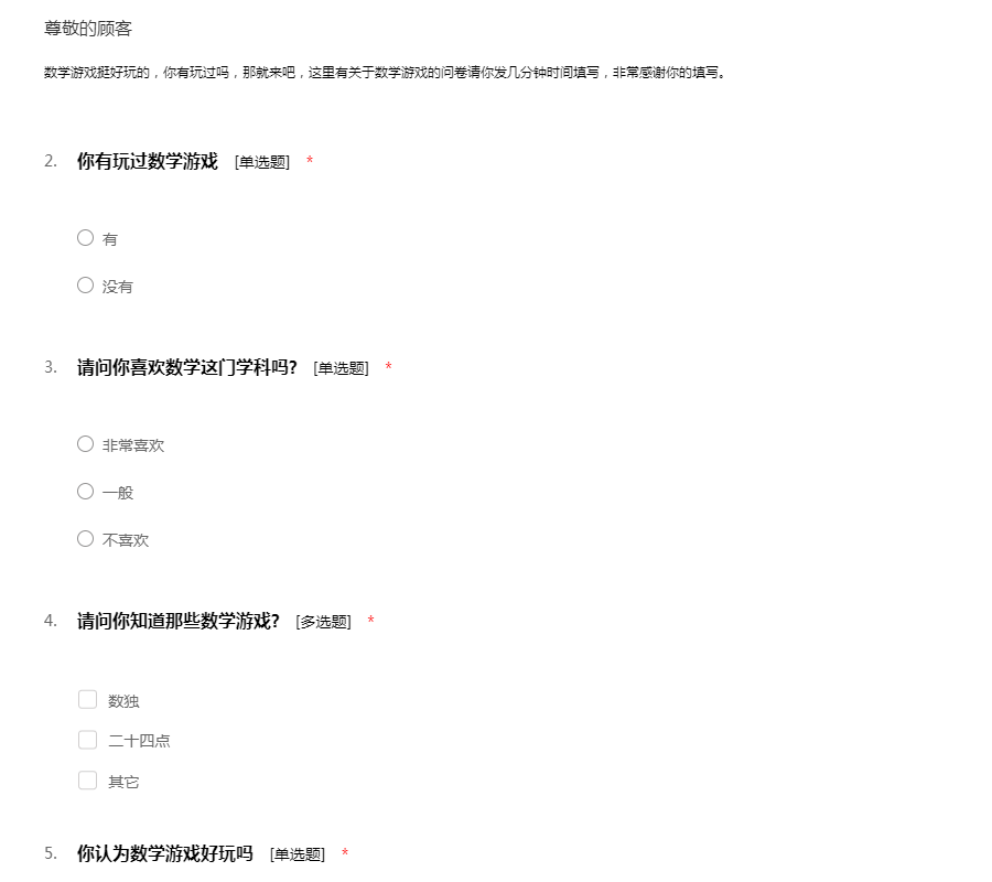 数学游戏挺好玩的,你有玩过吗,那就来吧,这里有关于数学游戏的问卷请你发几分钟时间填写,非常感谢你的填写。