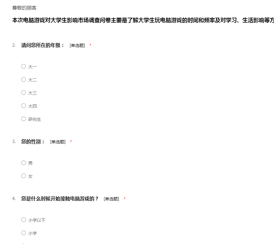 本次电脑游戏对大学生影响市场调查问卷主要是了解大学生玩电脑游戏的时间和频率及对学习、生活影响等方面的问题。