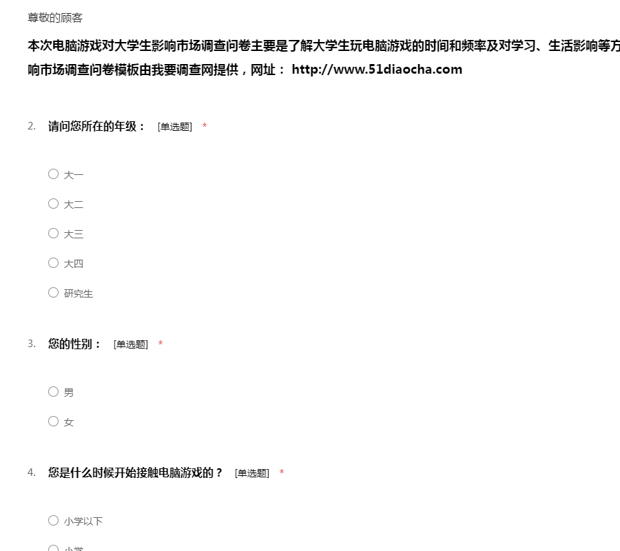 本次电脑游戏对大学生影响市场调查问卷主要是了解大学生玩电脑游戏的时间和频率及对学习、生活影响等方面的问题。电脑游戏对大学生影响市场调查问卷模板由我要调查网提供,网址: http://www.51diaocha.com