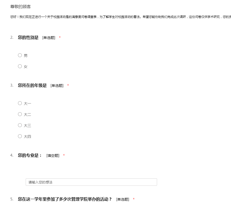 您好!我们现在正进行一个关于校园活动是的满意度问卷调查表,为了解学生对校园活动的看法。希望您能协助我们完成此次调研,这份问卷仅供学术研究,您的资料我们也将会严格保密。非常感谢您的配合!