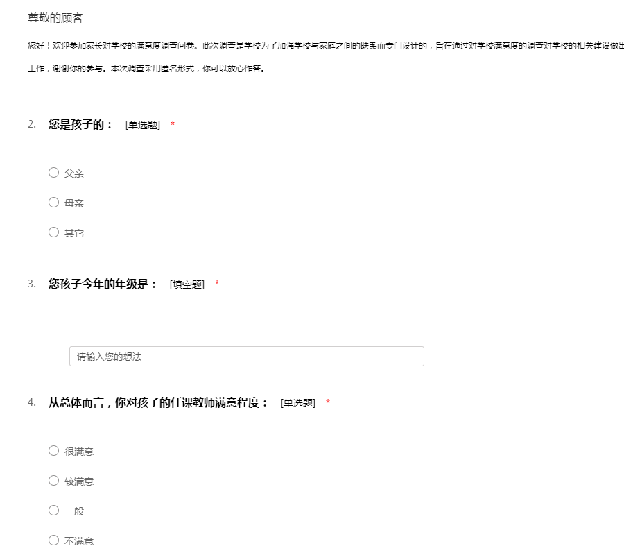您好!欢迎参加家长对学校的满意度调查问卷。此次调查是学校为了加强学校与家庭之间的联系而专门设计的,旨在通过对学校满意度的调查对学校的相关建设做出改进。希望你抽出一点时间积极配合我们的调查工作,谢谢你的参与。本次调查采用匿名形式,你可以放心作答。