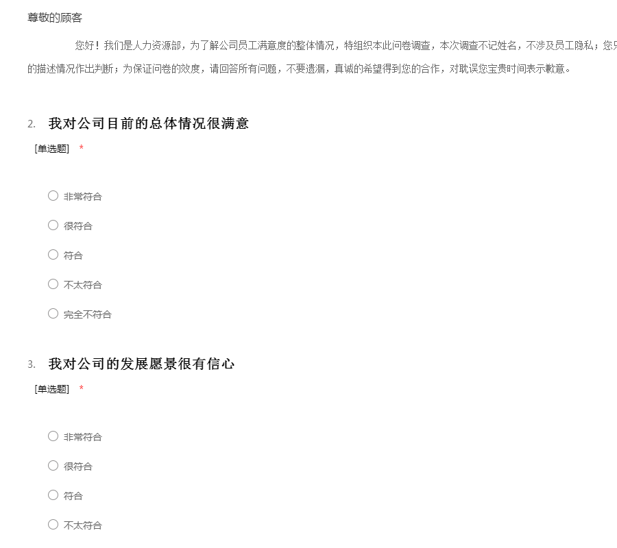 您好!我们是人力资源部,为了解公司员工满意度的整体情况,特组织本此问卷调查,本次调查不记姓名,不涉及员工隐私;您只需根据实际情况和个人真实看法对题目的描述情况作出判断;为保证问卷的效度,请回答所有问题,不要遗漏,真诚的希望得到您的合作,对耽误您宝贵时间表示歉意。