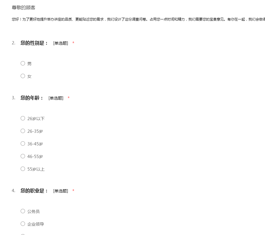 您好!为了更好地提升举办讲座的品质、更能贴近您的需求,我们设计了这份调查问卷。占用您一点时间和精力,我们需要您的宝贵意见。有你在一起,我们会做得更好。感谢您的支持!
