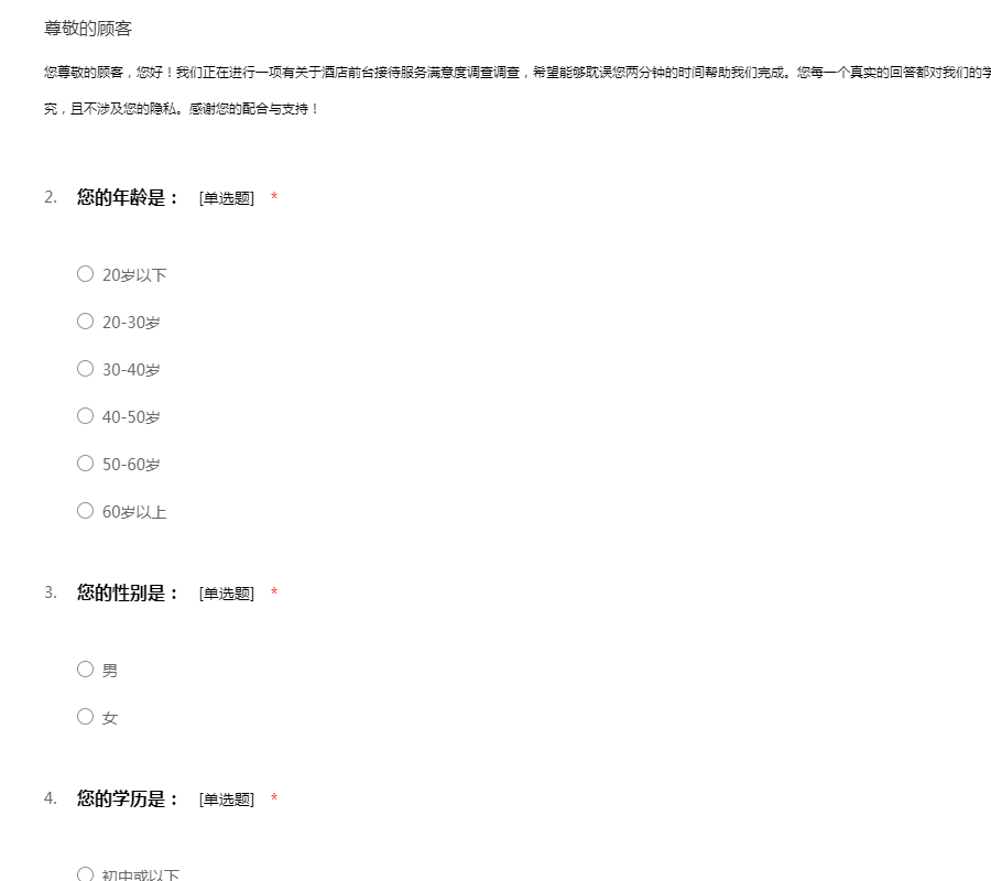 您尊敬的顾客,您好!我们正在进行一项有关于酒店前台接待服务满意度调查调查,希望能够耽误您两分钟的时间帮助我们完成。您每一个真实的回答都对我们的学士分析都有很大帮助!调查数据仅作为学术研究,且不涉及您的隐私。感谢您的配合与支持!