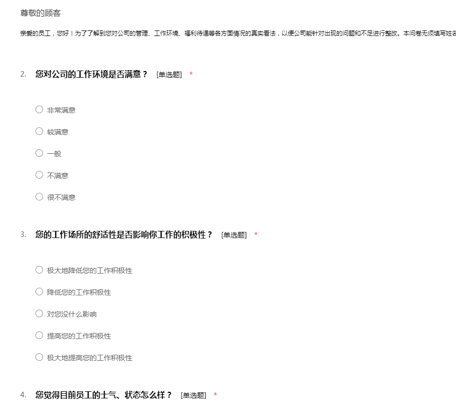 亲爱的员工,您好!为了了解到您对公司的管理、工作环境、福利待遇等各方面情况的真实看法,以便公司能针对出现的问题和不足进行整改。本问卷无须填写姓名,所以请放心的如实填写。感谢您的支持!