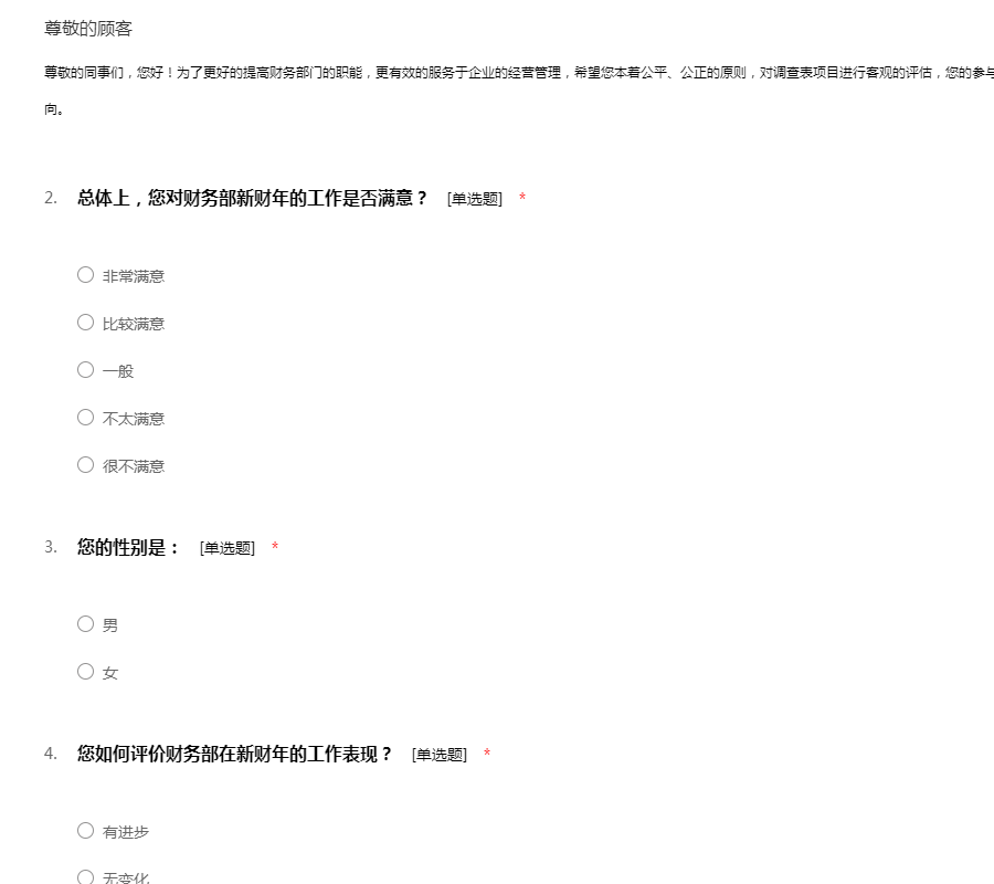 尊敬的同事们,您好!为了更好的提高财务部门的职能,更有效的服务于企业的经营管理,希望您本着公平、公正的原则,对调查表项目进行客观的评估,您的参与及反馈的意见是我们最大的鞭策及工作改进的方向。