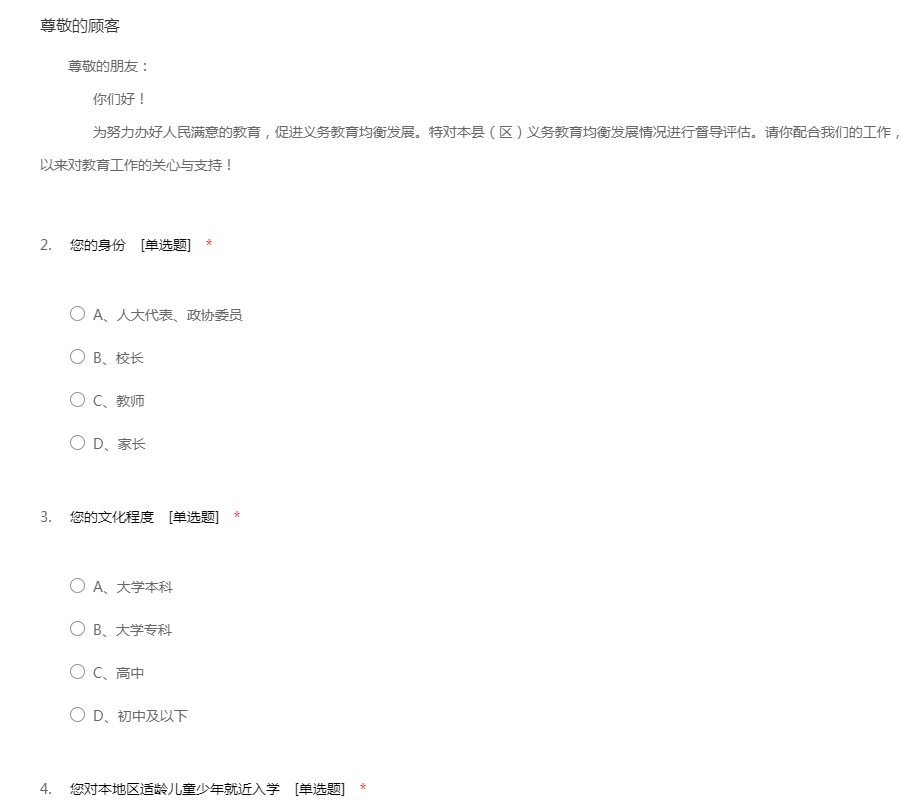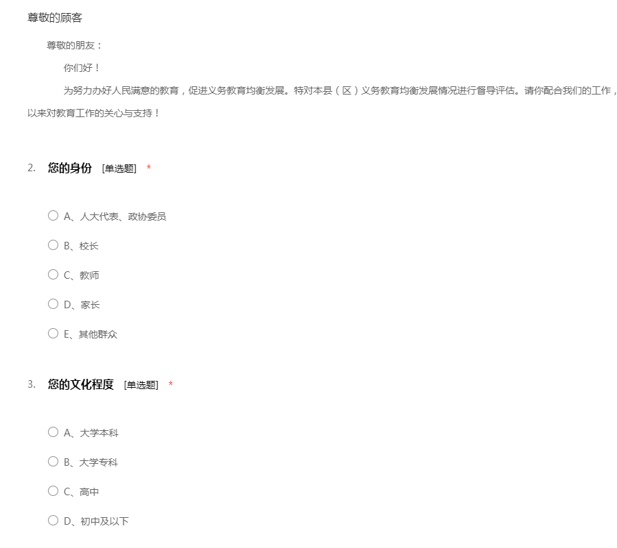尊敬的朋友: 你们好! 为努力办好人民满意的教育,促进义务教育均衡发展。特对本县(区)义务教育均衡发展情况进行督导评估。请你配合我们的工作,认真回答这份调查问卷,衷心感谢你长期以来对教育工作的关心与支持!