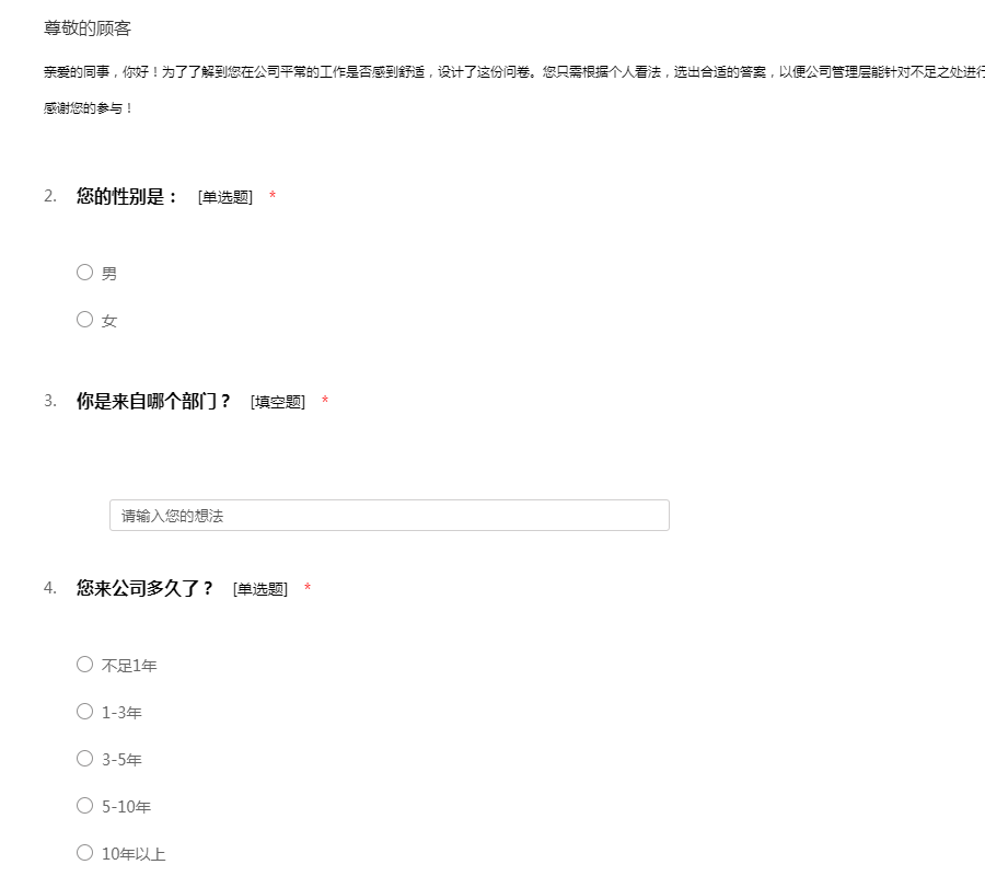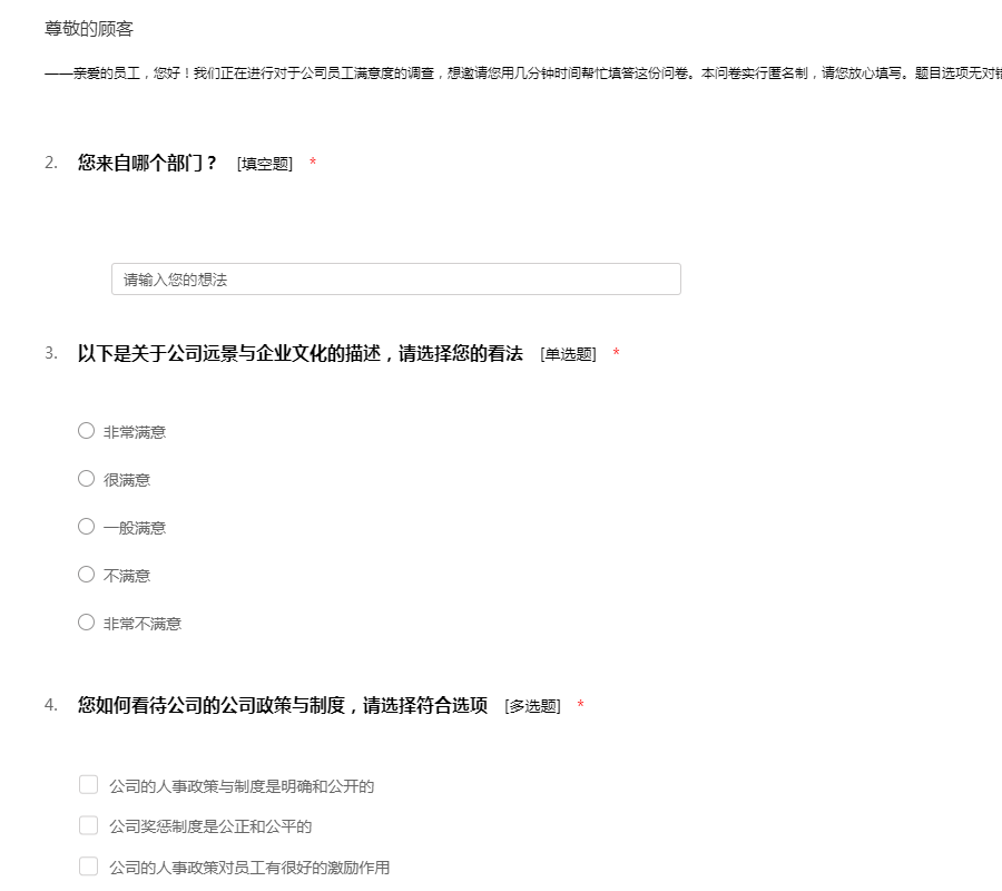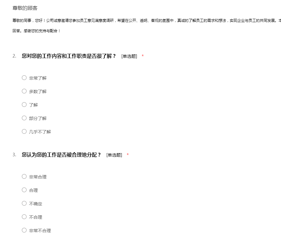 ——亲爱的员工,您好!我们正在进行对于公司员工满意度的调查,想邀请您用几分钟时间帮忙填答这份问卷。本问卷实行匿名制,请您放心填写。题目选项无对错之分,请自己的实际情况填写。感谢您的参与!
