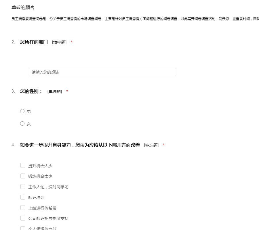 员工满意度调查问卷是一份关于员工满意度的市场调查问卷,主要是针对员工满意度方面问题进行的问卷调查,以此展开问卷调查活动,耽误您一些宝贵时间,回答 员工满意度调查问卷,谢谢您的合作。