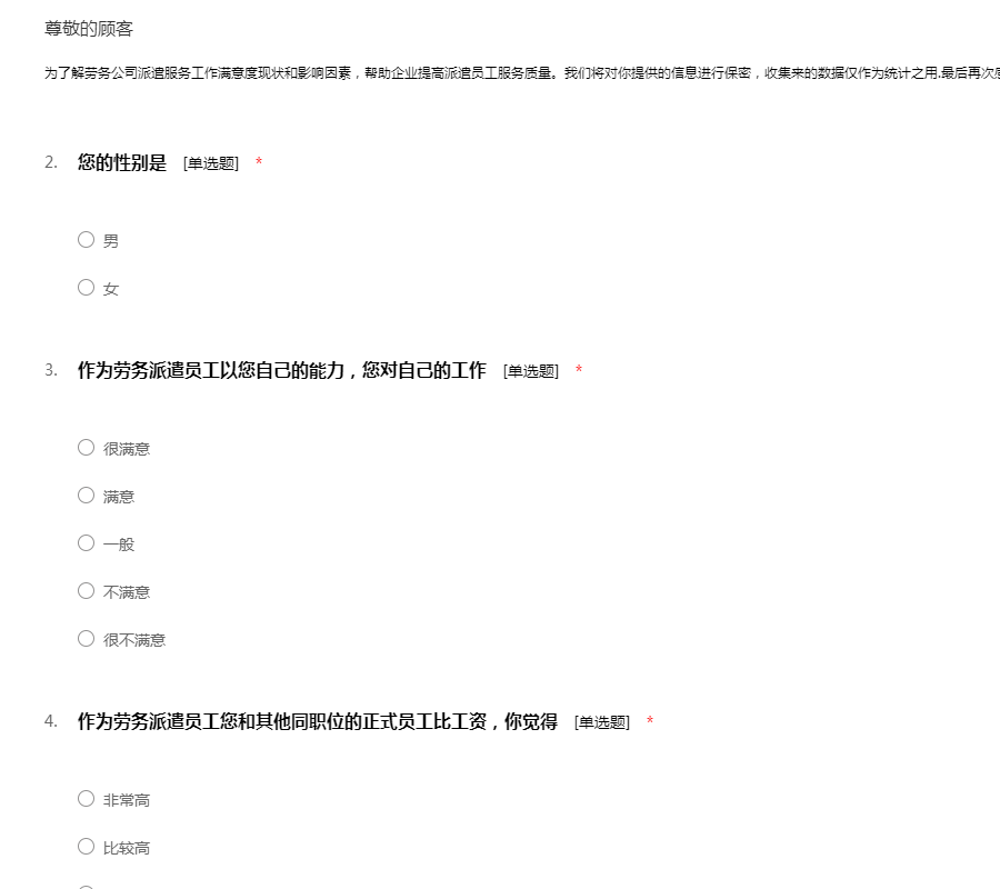 为了解劳务公司派遣服务工作满意度现状和影响因素,帮助企业提高派遣员工服务质量。我们将对你提供的信息进行保密,收集来的数据仅作为统计之用.最后再次感谢你的支持和配合。