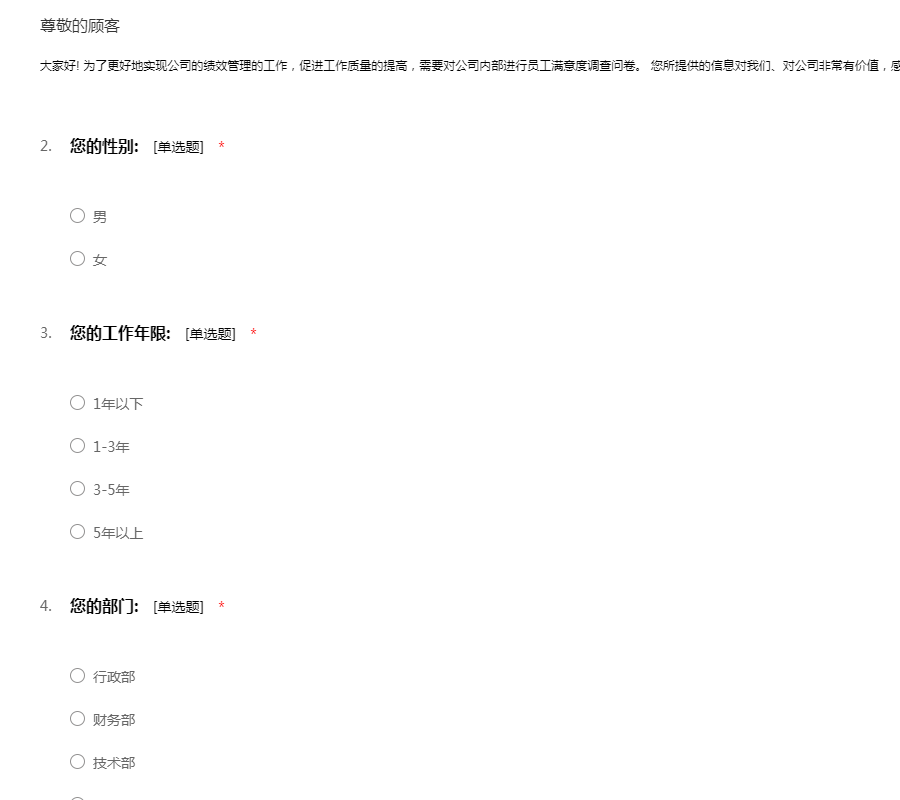 大家好! 为了更好地实现公司的绩效管理的工作,促进工作质量的提高,需要对公司内部进行员工满意度调查问卷。 您所提供的信息对我们、对公司非常有价值,感谢您的支持!