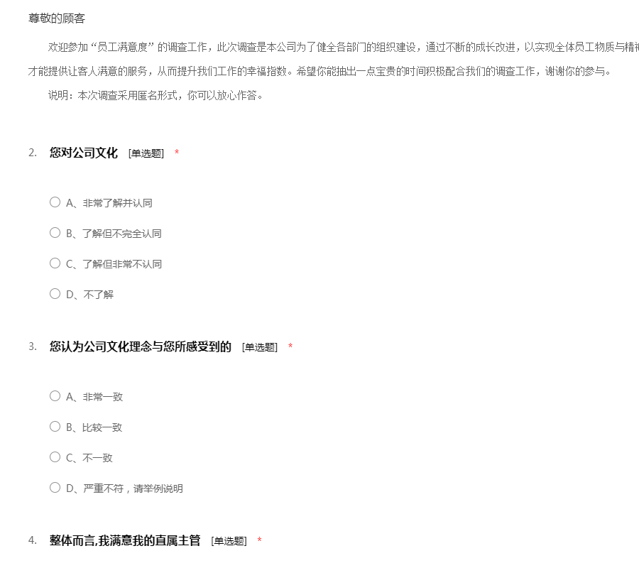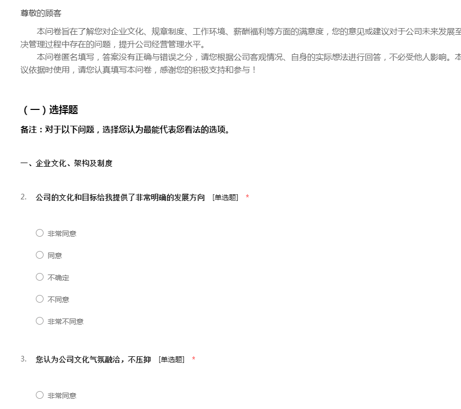 本问卷旨在了解您对企业文化、规章制度、工作环境、薪酬福利等方面的满意度,您的意见或建议对于公司未来发展至关重要,有助于公司有的放矢地解决管理过程中存在的问题,提升公司经营管理水平。 本问卷匿名填写,答案没有正确与错误之分,请您根据公司客观情况、自身的实际想法进行回答,不必受他人影响。本问卷只在人力资源范围作统计和建议依据时使用,请您认真填写本问卷,感谢您的积极支持和参与!