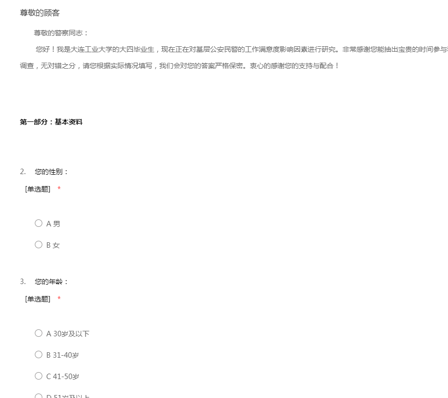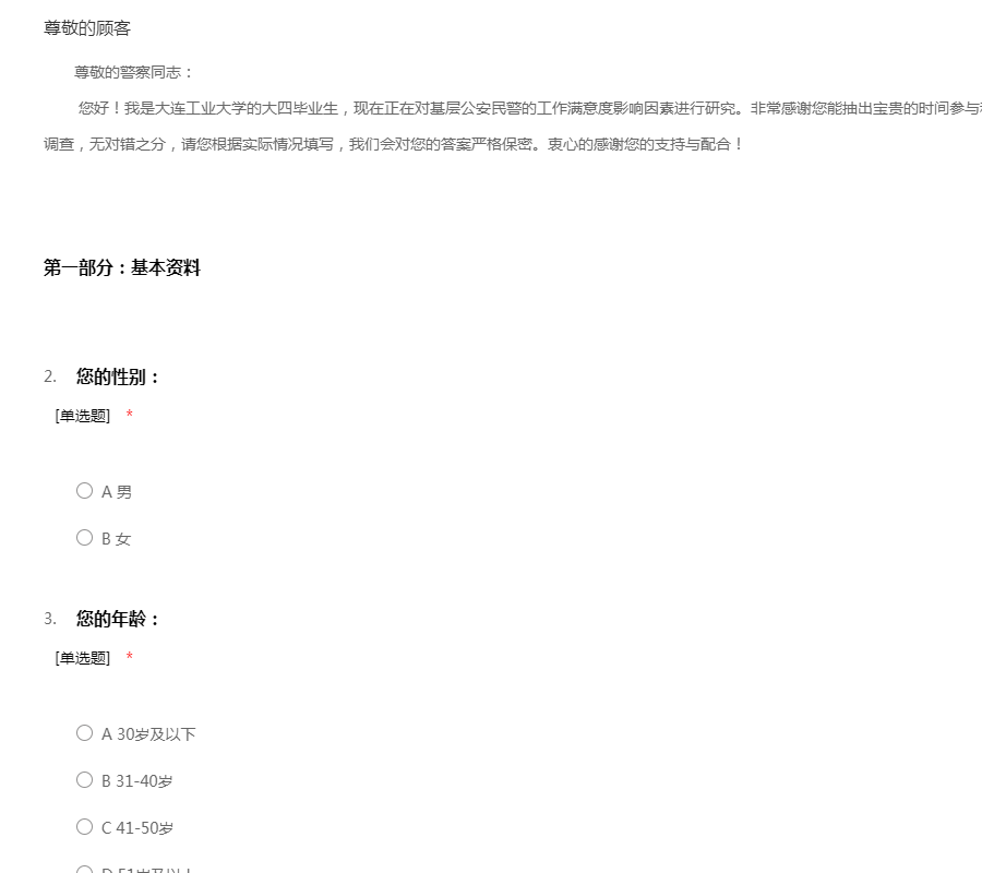 尊敬的警察同志: 您好!我是大连工业大学的大四毕业生,现在正在对基层公安民警的工作满意度影响因素进行研究。非常感谢您能抽出宝贵的时间参与和协助完成此次问卷调查,本问卷为匿名调查,无对错之分,请您根据实际情况填写,我们会对您的答案严格保密。衷心的感谢您的支持与配合!