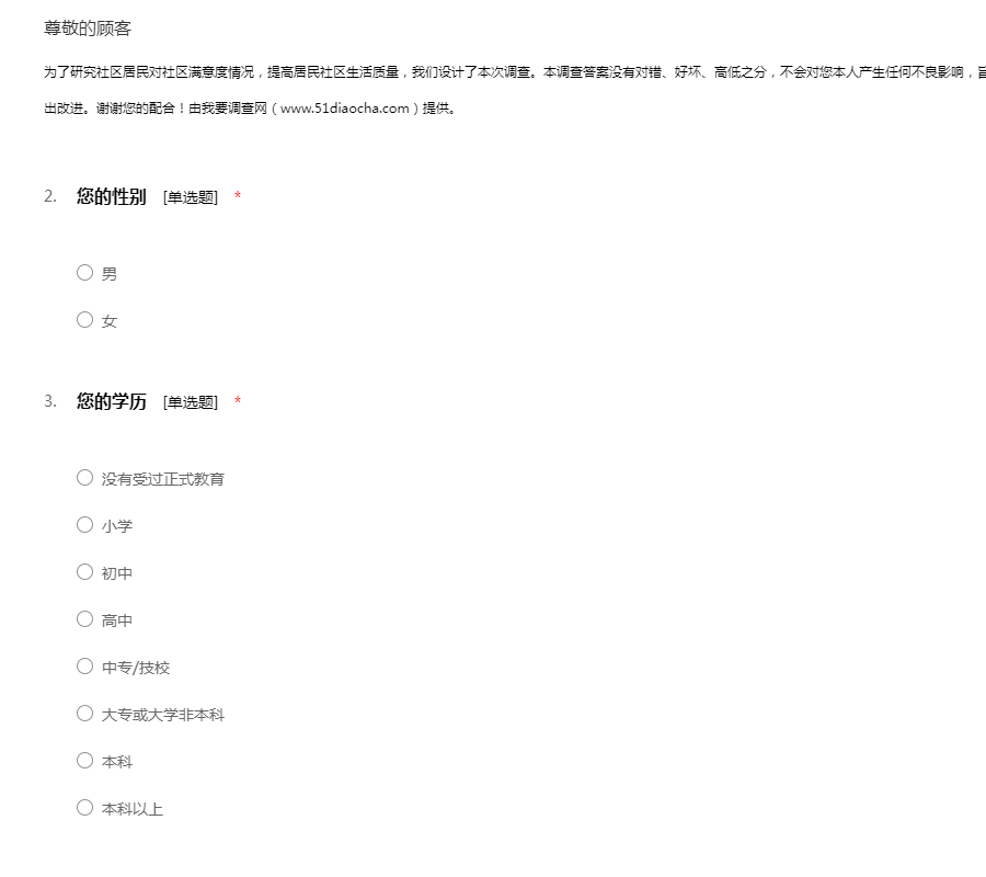 为了研究社区居民对社区满意度情况,提高居民社区生活质量,我们设计了本次调查。本调查答案没有对错、好坏、高低之分,不会对您本人产生任何不良影响,旨在通过对居民满意度的调查对社区的相关建设做出改进。谢谢您的配合!由我要调查网(www.51diaocha.com)提供。