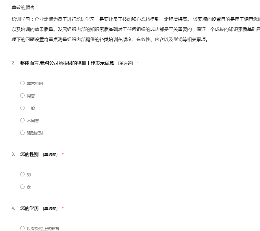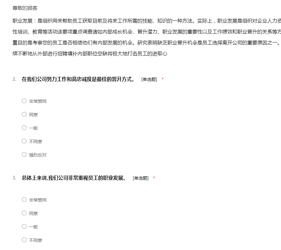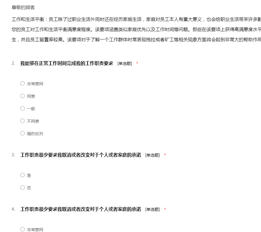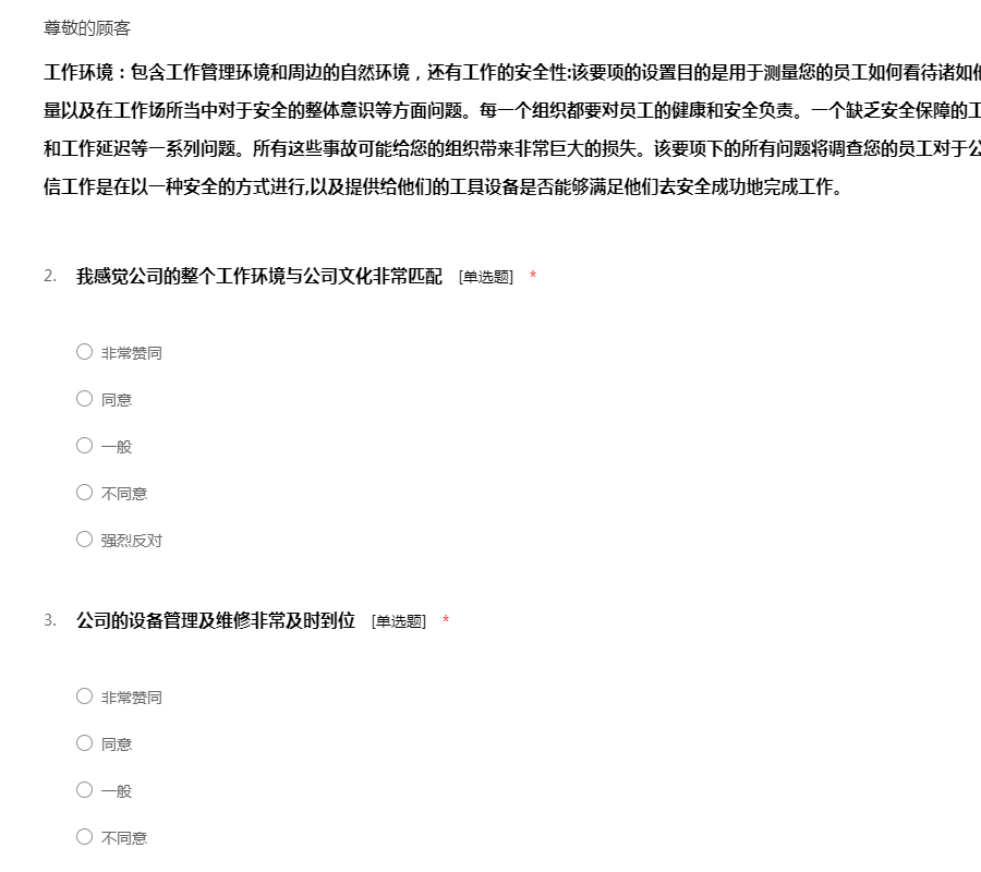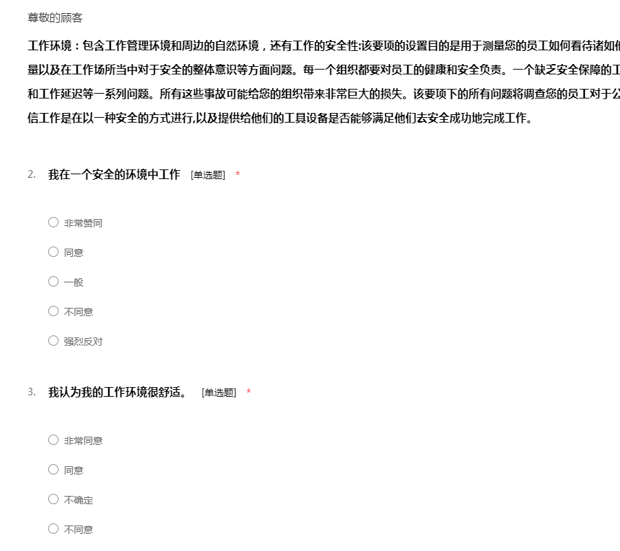 工作环境:包含工作管理环境和周边的自然环境,还有工作的安全性:该要项的设置目的是用于测量您的员工如何看待诸如他们的工作环境条件、设备工具的质量以及在工作场所当中对于安全的整体意识等方面问题。每一个组织都要对员工的健康和安全负责。一个缺乏安全保障的工作环境将导致各类事故、法律诉讼和工作延迟等一系列问题。所有这些事故可能给您的组织带来非常巨大的损失。该要项下的所有问题将调查您的员工对于公司的设施工具是否满意,他们是否相信工作是在以一种安全的方式进行,以及提供给他们的工具设备是否能够满足他们去安全成功地完成工作。