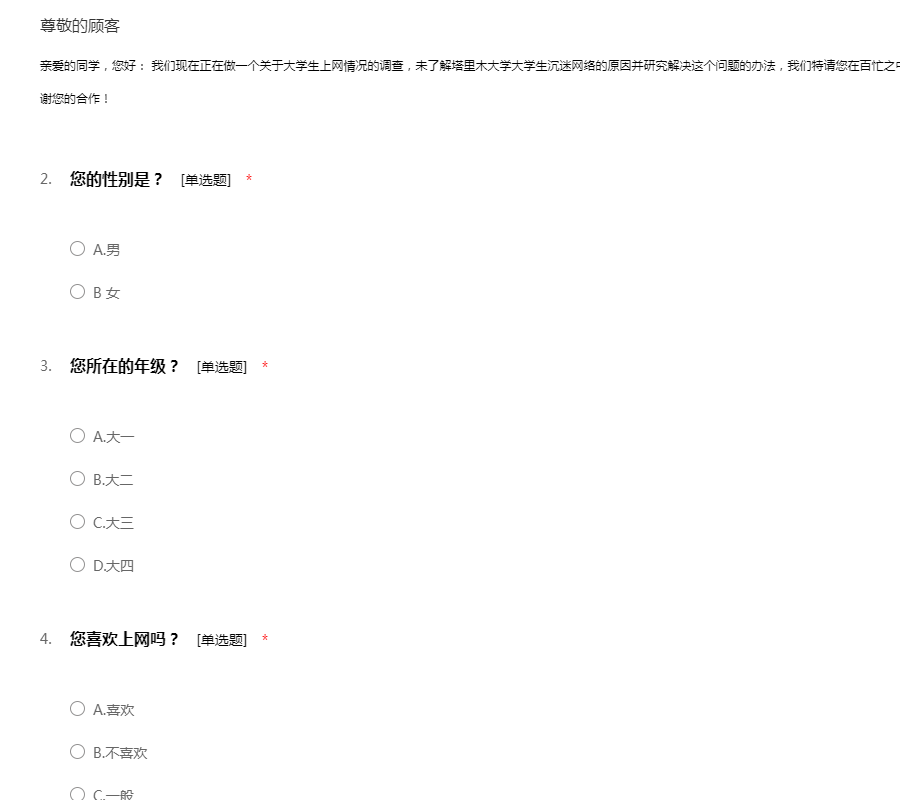 亲爱的同学,您好: 我们现在正在做一个关于大学生上网情况的调查,未了解塔里木大学大学生沉迷网络的原因并研究解决这个问题的办法,我们特请您在百忙之中参加此次问卷的调查。请您客观正确填写。 感谢您的合作!