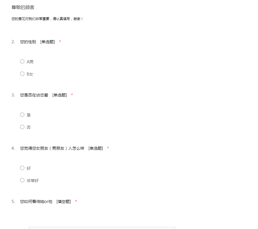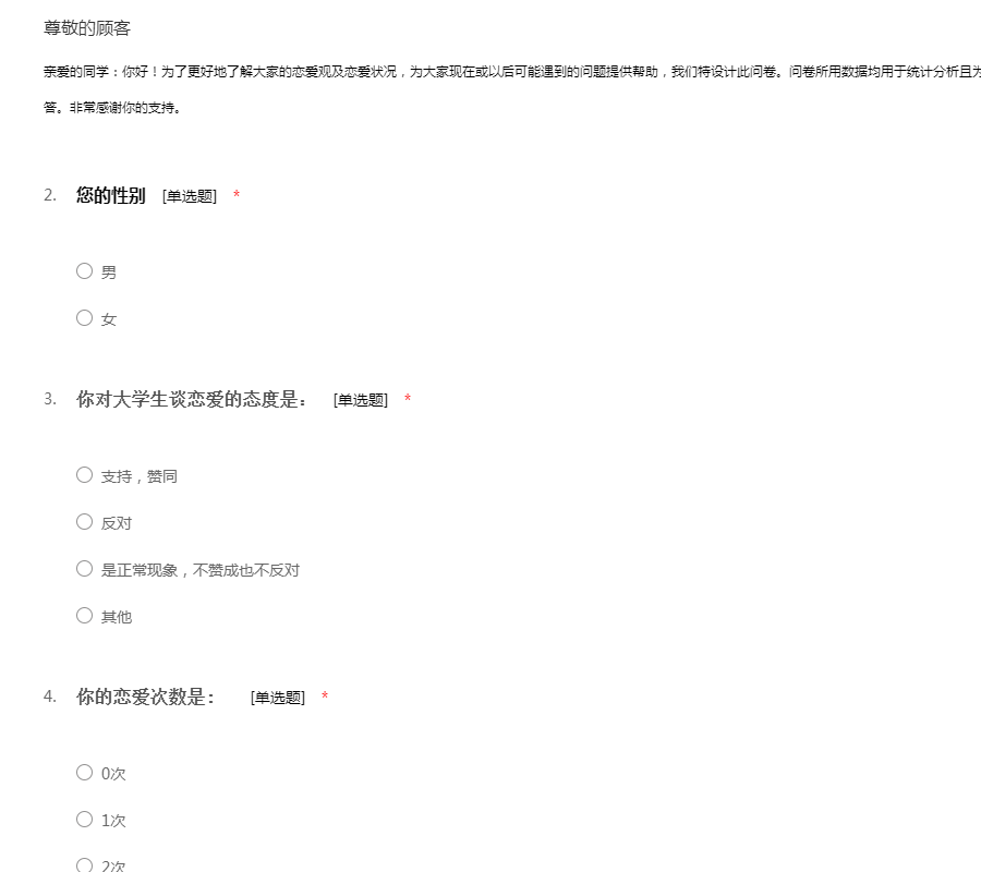 亲爱的同学:你好!为了更好地了解大家的恋爱观及恋爱状况,为大家现在或以后可能遇到的问题提供帮助,我们特设计此问卷。问卷所用数据均用于统计分析且为匿名调查,我们会保护你的隐私权,望如实回答。非常感谢你的支持。