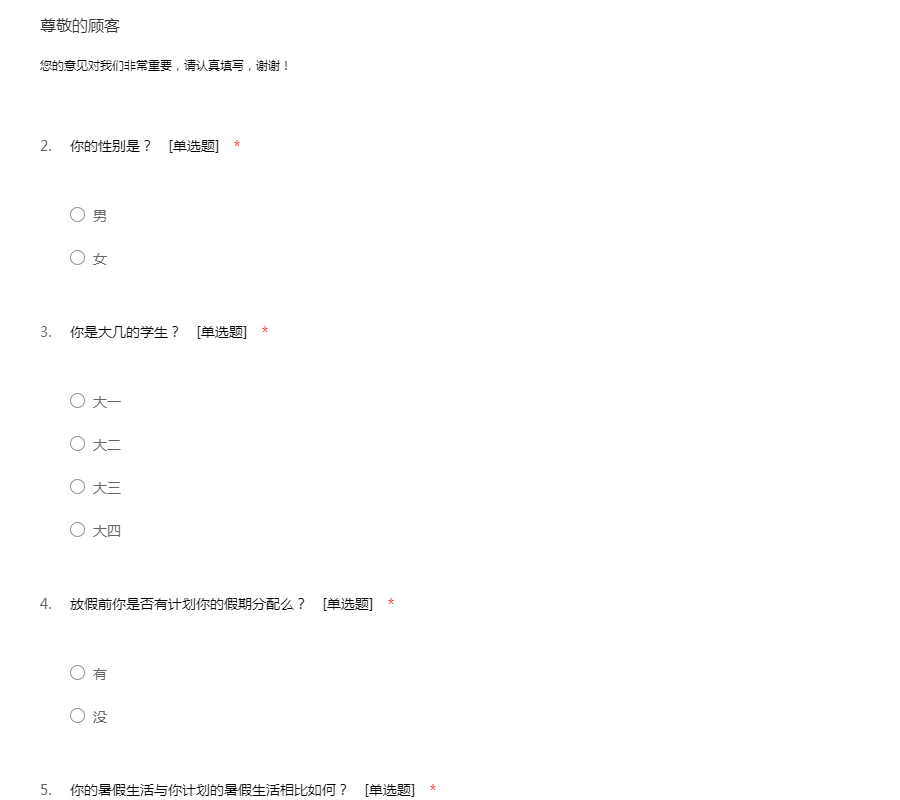 亲爱的同学,你好!作为一名大学生,已经有半只脚踏进了社会。因为,在学习之余的假期,应该做些什么才会更有意义呢?快来填写本次的问卷,留下你宝贵的建议。本问卷是不记名的,所以请放心填写。感谢你的支持与配合!