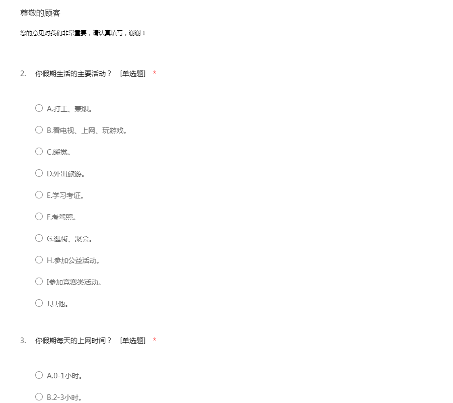 您好,十分感谢您百忙之中抽出时间参与本次关于大学生课余生活调查问卷的活动。通过这次调查,希望大家对自己的课余生活有一个全新的认识。希望此次调查能得到您的支持和帮助*^_^*