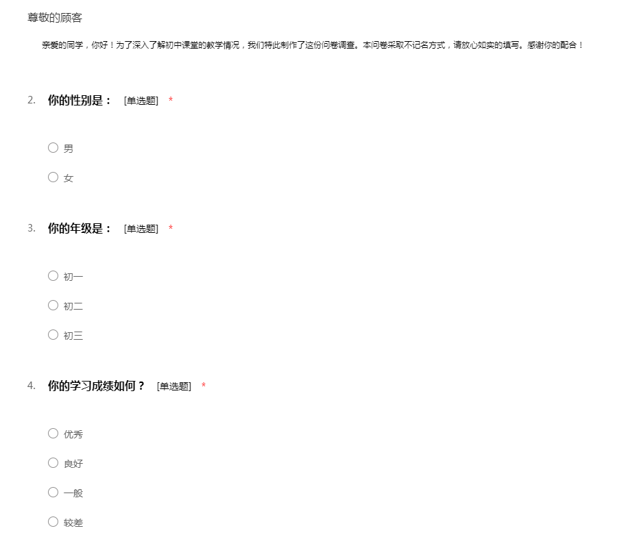 亲爱的同学,你好!为了深入了解初中课堂的教学情况,我们特此制作了这份问卷调查。本问卷采取不记名方式,请放心如实的填写。感谢你的配合!
