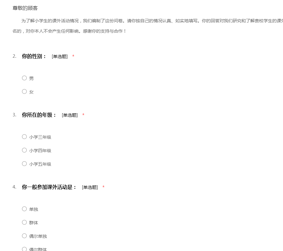 为了解小学生的课外活动情况,我们编制了这份问卷。请你按自己的情况认真、如实地填写。你的回答对我们研究和了解贵校学生的课外活动情况有很大帮助。这个问卷是不记名的,对你本人不会产生任何影响。感谢你的支持与合作!