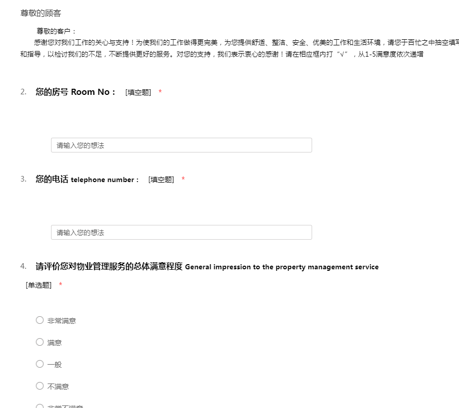 尊敬的客户:感谢您对我们工作的关心与支持!为使我们的工作做得更完美,为您提供舒适、整洁、安全、优美的工作和生活环境,请您于百忙之中抽空填写此调查表,对我们的工作进行评价、建议和指导,以检讨我们的不足,不断提供更好的服务。对您的支持,我们表示衷心的感谢!请在相应框内打“√”,从1-5满意度依次递增